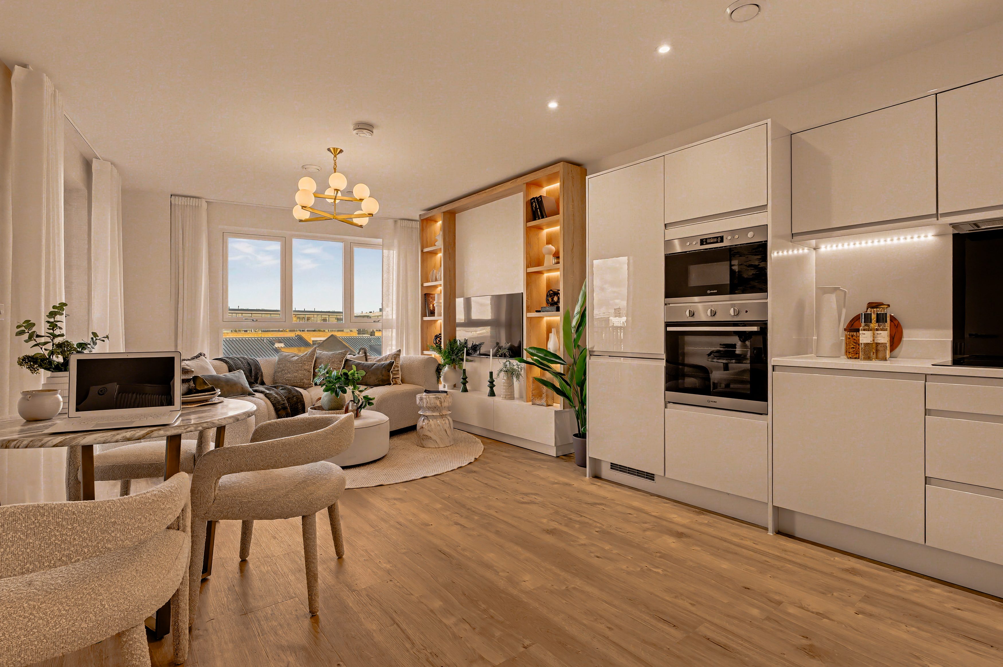 The specification: Your apartment is a stylish, energy-efficient sanctuary with a flexible, open-plan layout and a private balcony or terrace. The high-quality specification includes gloss grey handleless kitchen units, Quartz worktops, fully integrated appliances (oven, induction hob, microwave, fridge/freezer, dishwasher), Amtico Spacia flooring, and luxurious bathrooms with full-height tiling and a chrome heated towel rail.