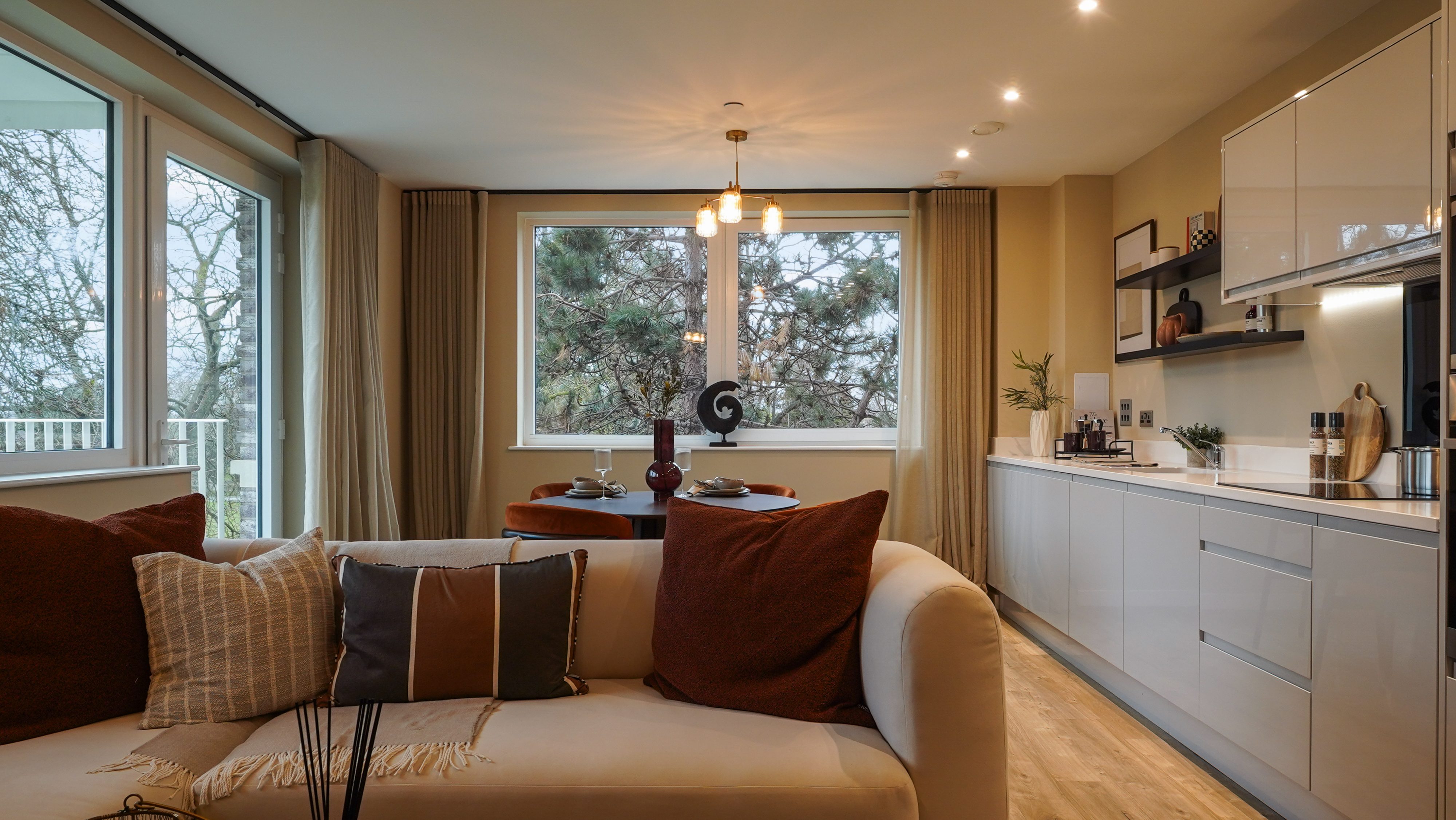 The specification: Your apartment is a contemporary, energy-efficient home with an open-plan layout and private balcony or terrace. The high-quality specification includes gloss grey handleless kitchen units, Quartz worktops, fully integrated appliances (oven, microwave, hob, fridge/freezer, dishwasher), Amtico flooring, and luxurious bathrooms with full-height tiling and chrome heated towel rails.